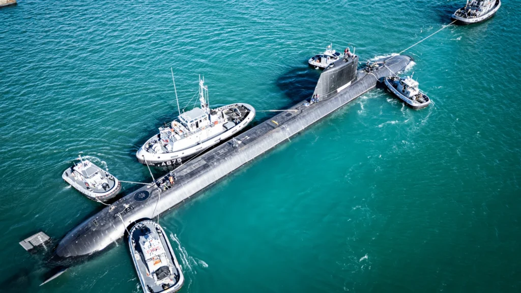 These vessels are designed for increased versatility and stealth compared to their predecessors, featuring a surface displacement of 4,700 tonnes and a diving displacement of 5,200 tonnes. The hull measures 99 metres in length with a diameter of 8.8 metres. Armament consists of MBDA naval cruise missiles (NCM) for deep-strike capabilities, F21 heavyweight wire-guided torpedoes, and SM39 anti-ship missiles. Hybrid propulsion is provided by a pressurised water reactor, one propulsion turbine, two turbo generators, and two electric motors. Each submarine is manned by a crew of 63 and includes dedicated facilities for the discrete deployment of Special Forces.