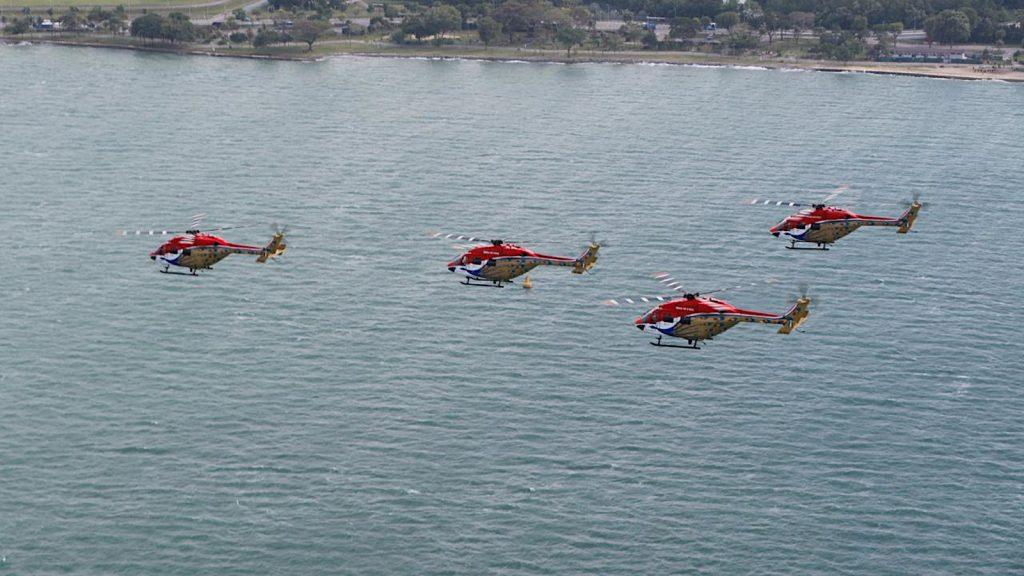The Sarang team operates the indigenously developed ‘Dhruv’ 5-tonne utility helicopter which was designed and developed by state-owned airframer Hindustan Aeronautics Limited (HAL). The Dhruv helicopter features rigid, hinge-less rotors making it highly maneuverable and the variant flown by the Sarang team is the Dhruv Mk-I, which is the oldest version of the helicopter and is powered by twin Safran Helicopter Engines TMB-333 B2 engines delivering 825kW each. The other variants of the Dhruv are the Mk-II, Mk-III, Mk-IV, and Mk-III maritime.