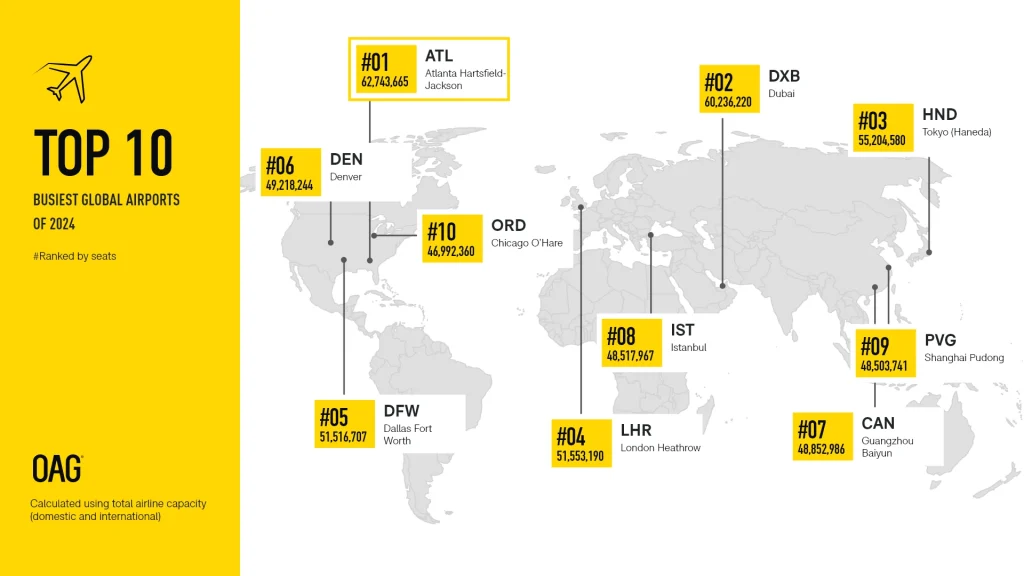 Atlanta Hartsfield-Jackson International Airport (ATL) continues to hold the title of the world’s busiest airport, with 62.7 million seats, followed by Dubai International Airport (DXB) in second and London Heathrow (LHR) in fourth.