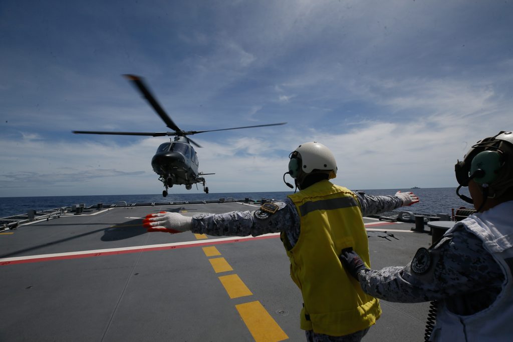An AW109 helicopter takes off from the Philippine Navy’s BRP Diego Silang during a flight deck operation on Monday, Feb. 16. (Jeoffrey Maitem)