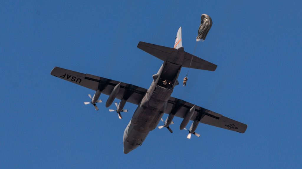 Using its aft loading ramp and door, the C-130 can accommodate a wide variety of oversized cargo, including everything from utility helicopters and six-wheeled armored vehicles to standard palletized cargo and military personnel. In an aerial delivery role, it can airdrop loads up to 42,000 pounds or use its high-flotation landing gear to land and deliver cargo on rough, dirt strips.